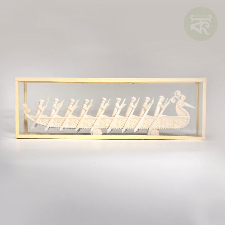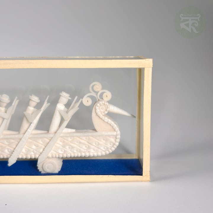 Exquisite Handcrafted Art: A stunning Shola Pith creation, this artistic thermocol boat beautifully depicts traditional craftsmanship with intricate detailing. Each figure and element is carefully handmade by skilled artisans.